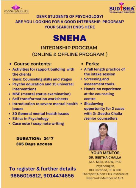Sneha ,an Internship Program provided for the students who have a minimum of one subject as Psychology.