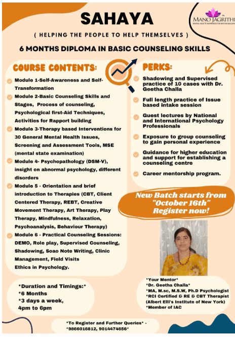 SAHAYA 6 months Diploma in Basic Counseling Skills Course at Manojagrithi is an unique course, this diploma is one of its kind. It is beautifully designed counseling skills training program after 25 years of research and practice by a group of dedicated psychologists under the guidance of Dr.Geeta Challa, the founder of Manojagrithi. The course duration is for 6 months. It consists of 6 modules. Every module is independent by itself and together they help in gaining immense practical knowledge & skills of counseling.